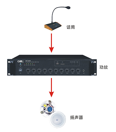 一個公共廣播系統(tǒng)起碼須配置下列環(huán)節(jié):廣播揚聲器,廣播功放,話筒(及其他音源設(shè)備)。簡單的系統(tǒng)如下圖所示,其中廣播話筒具有優(yōu)先權(quán),即話筒信號能自動覆蓋其他音源信號。